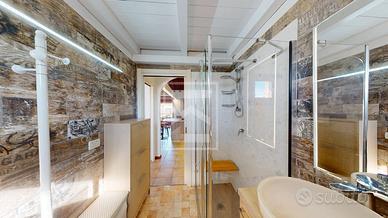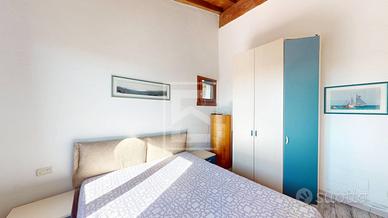 La terrazza è di 15 mq e attrezzata con barbecue, ideale per pranzare all'aperto e godersi la bella stagione. La zona notte è separata dalla zona giorno da disimpegno. Due camere da letto, bagno finestrato con doccia. Travi a vista in tutta la casa.