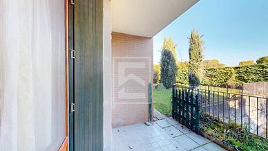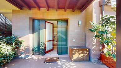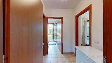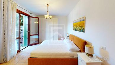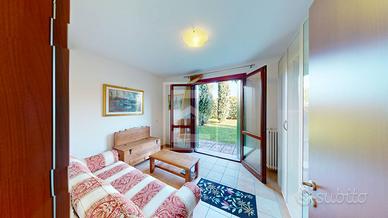 Lingresso conduce a unampia e luminosa zona giorno con accesso diretto al primo giardino privato. Un disimpegno porta alla camera matrimoniale e alla camera singola, entrambe con uscita sul grande giardino sul retro, ideale per momenti di relax. A completare la disposizione interna un bagno finestrato con doccia.