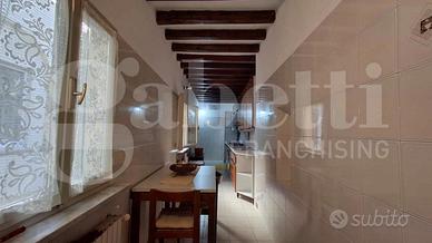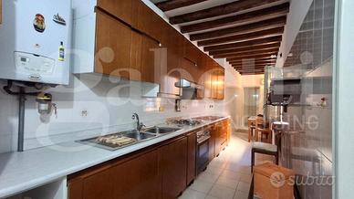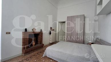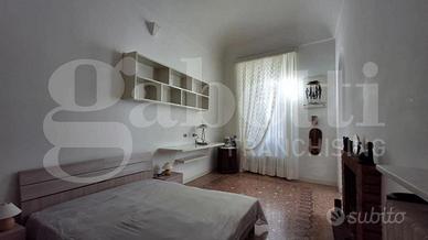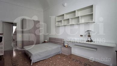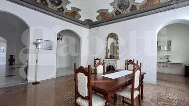 Lo spazioso ingresso, con vetrate con affaccio sul cortile interno, è dotato di armadio a muro ad uso guardaroba e conduce all'articolata zona giorno, composta da tre ambienti comunicanti con alti soffitti in parte affrescati e camino, pavimentati con seminato veneziano, oltre ad un primo bagno finestrato.