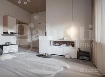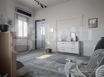 Attualmente corredata da due ingressi, dispone di zona giorno con angolo cottura, bagno finestrato e due camere (o camera con studio/cabina armadi) con balcone fronte strada.