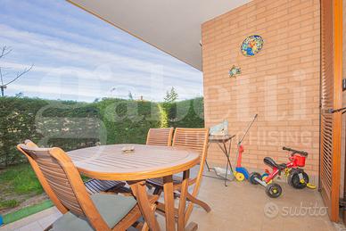 L'alloggio è posto al piano terra ed è composto da ingresso su soggiorno con accesso al terrazzo e al giardino, cucina abitabile con accesso diretto al giardino, disimpegno, due camere e bagno.