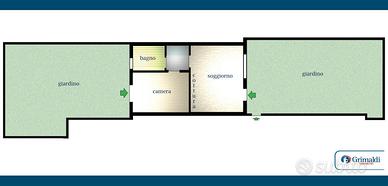 Un piccolo disimpegno separa la zona notte con la camera da letto dotata di portafinestra con accesso al secondo giardino, ed il bagno è finestrato.