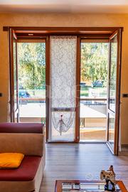 All'interno, sviluppato su di un unico livello, troviamo un ampio ingresso che introduce al luminoso soggiorno-salotto, caratterizzato da ampie finestre, collegato a un affascinante terrazzino coperto. La cucina abitabile è uno spazio separato, anch'essa con accesso a un secondo terrazzino, dove si potrà preparare gustose pietanze per le vostre cene. La zona notte è ben distinta dal soggiorno e risulta composta da due ampie e spaziose camere matrimoniali. Due bagni aggiungono comfort: uno, finestrato e completo risulta elegante e moderno, arricchito dalla presenza di ribassamenti nel soffitto con luci a led mentre il secondo servizio è attualmente utilizzato come lavanderia in modo funzionale, offre l'opportunità di sfruttare la sinergia con l'esterno. Completa la parte abitativa uno spazioso ripostiglio sempre