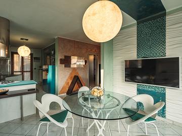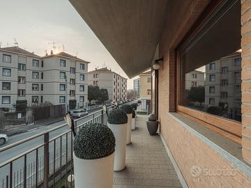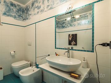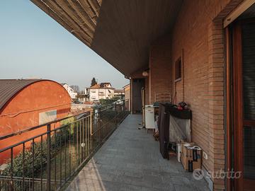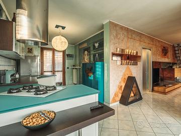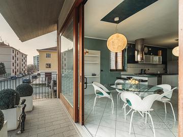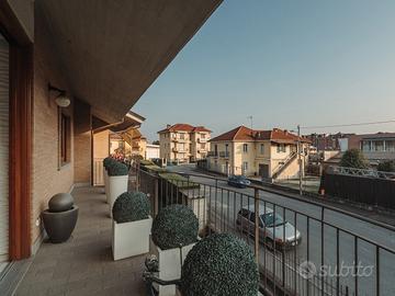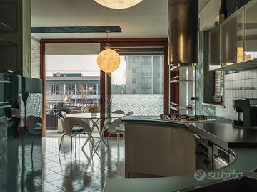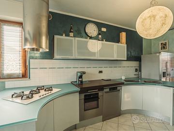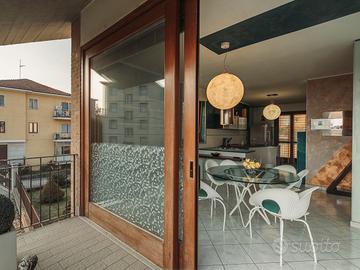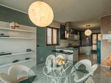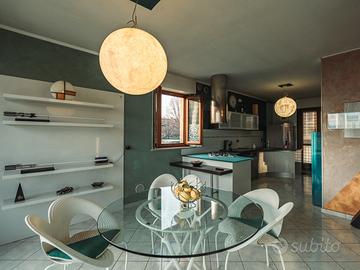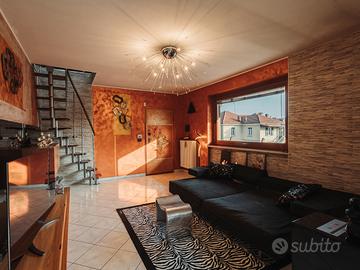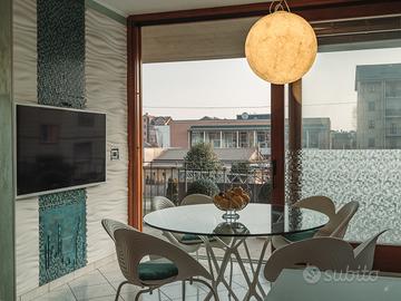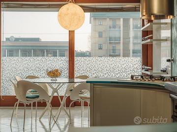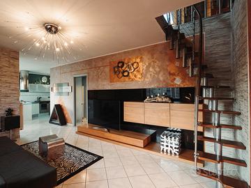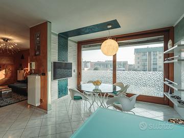 All'interno di questo contesto esclusivo, al primo e ultimo piano, si sviluppa un raffinato appartamento bilivello,di 125 mq. commerciali, caratterizzato da una posizione angolare e un'eccellente esposizione sud-ovest, elementi che garantiscono ambienti luminosi e un'atmosfera accogliente in ogni stagione. L'ingresso in open space è concepito per esaltare la percezione dello spazio e la fluidità della vita domestica. Il salotto, reso suggestivo da un'importante vetrata, si fonde armoniosamente con la zona pranzo e la cucina, dando vita a un ambiente dove estetica e funzionalità trovano un perfetto equilibrio. L'interazione tra interno ed esterno è esaltata dalla presenza di due terrazzi, autentiche estensioni della zona giorno, ideali per vivere momenti conviviali. Un muro discreto delinea un'area che si presta all'inserimento di un camino, ulteriore elemento di charme che potrebbe arricchire l'atmosfera domestica con il calore del fuoco.