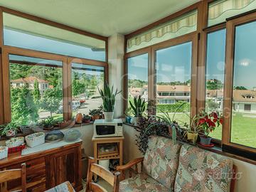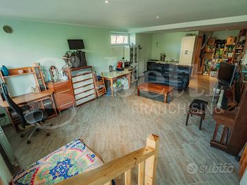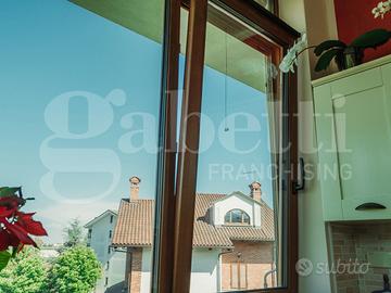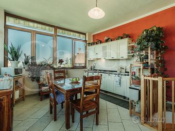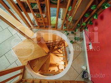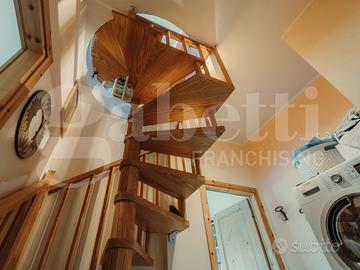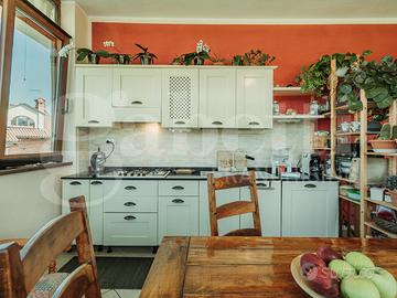 Al primo piano si sviluppa la zona giorno, luminosa e ben distribuita: la cucina abitabile è valorizzata da ampie vetrate che permettono allo sguardo di spaziare verso l'esterno, ampliando la percezione dello spazio e regalando una costante sensazione di apertura. Adiacente, un piccolo angolo salotto riservato e raccolto, ideale per momenti di pausa o conversazione. Su questo stesso livello è presente anche un primo servizio, comodo e funzionale.