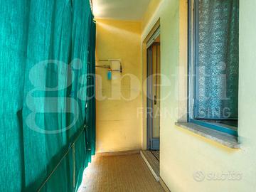 L'alloggio si sviluppa su 83 mq con doppia esposizione e spazi ben articolati: ingresso su disimpegno, tinello con cucinino, due camere, bagno finestrato, ripostiglio, due balconi e cantina.