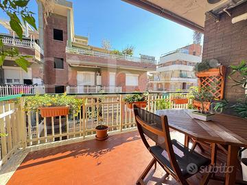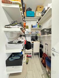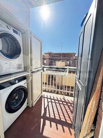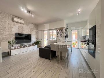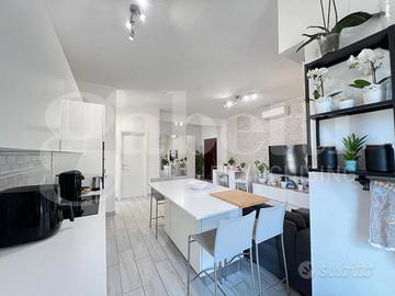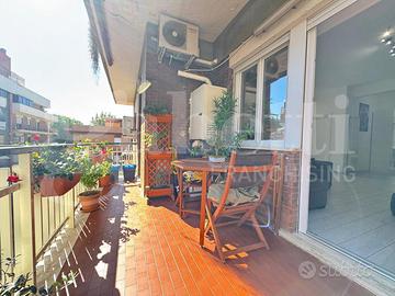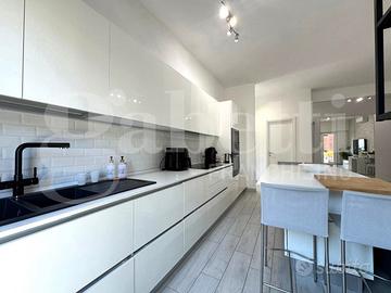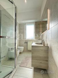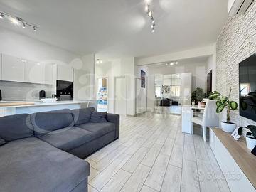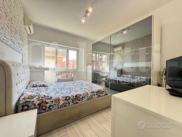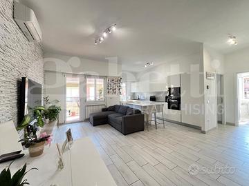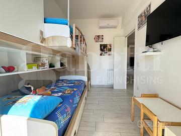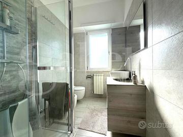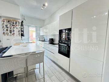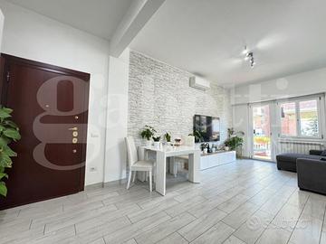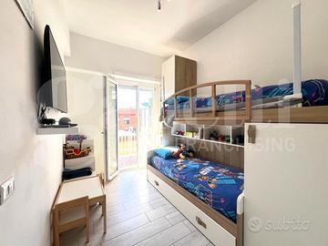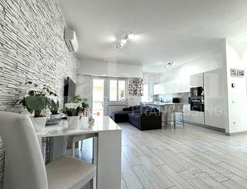 L'interno, completamente ristrutturato, vanta una cucina a vista con penisola, un ampio salone, due camere da letto di cui una matrimoniale e una cameretta, e due balconi di cui uno abitabile che offrono una doppia esposizione e la possibilità di mangiare fuori nelle belle giornate estive, entrambi con tende da sole. Inoltre, è dotato di ripostiglio, box auto, infissi in doppio vetro PVC e tapparelle elettriche.