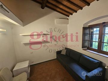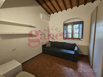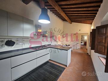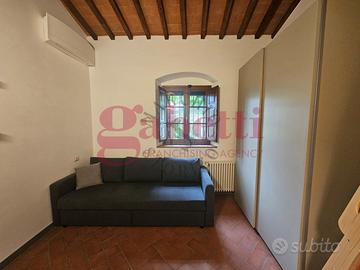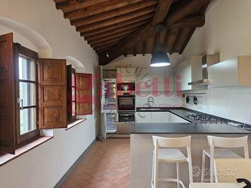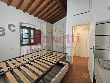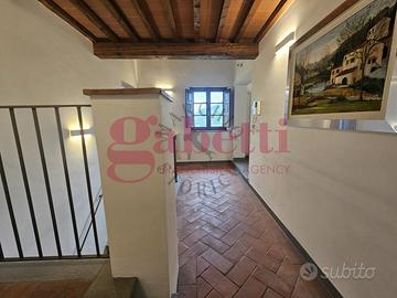 Immerso in contesto collinare, a pochi minuti dal centro abitato e a soli 10 minuti da Firenze Sud, proponiamo in vendita PORZIONE DI COLONICA di 137 mq su due livelli, inserito in un piccolo complesso signorile di recente ristrutturazione e di carattere storico con viste panoramiche sul paesaggio circostante. L'ingresso è indipendente, e avviene tramite il GIARDINO DI PROPRIETA' di 42 mq. Al piano terra troviamo un comodo locale di servizio, dove sono presenti la caldaia e l'impianto di allarme dell'intera abitazione. Da qui si accede al piano superiore tramite scala in pietra serena, che insieme ai pavimenti in cotto e alle travi a vista dona all'immobile un'eleganza tipicamente toscana. Al piano primo si sviluppa la zona giorno, composta da una spaziosa cucina abitabile con arredi su misura, soggiorno separato e bagno di servizio (non finestrato). La zona notte offre due ampie camere matrimoniali, di cui una con soppalco, e BAGNO FINESTRATO. Completa la proprietà una soffitta sottotetto, utile come spazio accessorio, e un ampio POSTO AUTO di 24 mq. L'immobile si presenta in condizioni impeccabili, non necessita di alcun intervento ed è venduto completamente arredato come da foto. Pronto per essere abitato da subito.