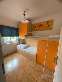 L'appartamento può ospitare un massimo di 5 persone. Curato, pulito, arredato, munito d'impianto di condizionamento/riscaldamento, TV, lavatrice e posto auto privato. Composto da due camere da letto ( una matrimoniale e una tripla con letti a soppalco e uno singolo), cucina fornita di tutti gli utensili e stoviglie di vario genere, soggiorno, bagno con box doccia e ampia terrazza vivibile a livello. Biancheria da letto e set asciugamani bagno disponibili gratuitamente in loco.