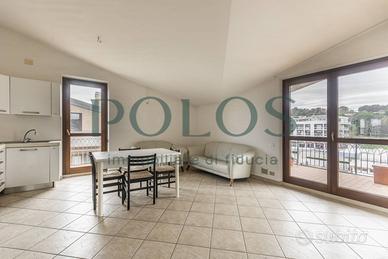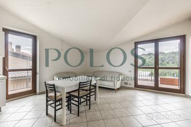 La soluzione si apre su un ampio e accogliente soggiorno con cucina a vista e accesso sullo spazioso terrazzo che circonda l'abitazione. Un pratico ripostiglio completa la zona giorno.
