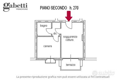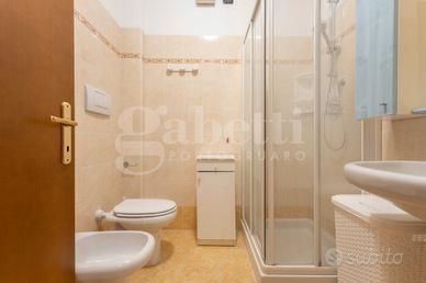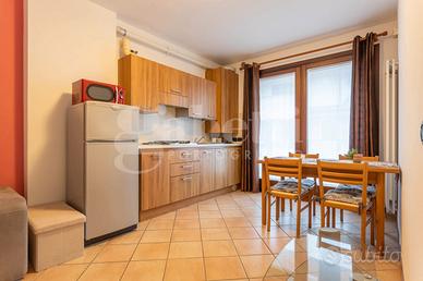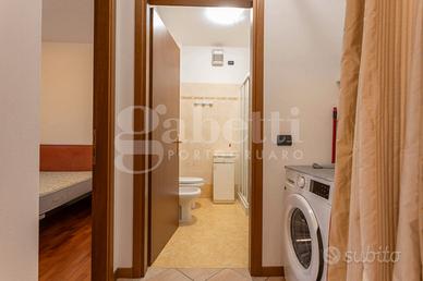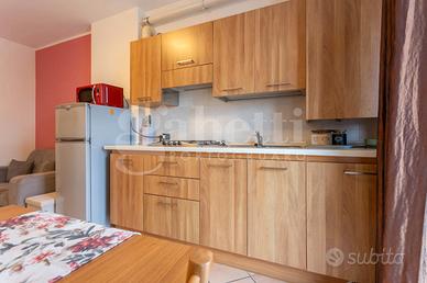 L'appartamento, in classe energetica C, è posto al secondo piano ed è servito da ascensore. L'ingresso si apre direttamente sulla zona giorno, composta da soggiorno con angolo cottura in ambiente unico, contenuto ma ben illuminato. Un disimpegno suddivide la camera matrimoniale con pavimenti in parquet e poggiolo dal bagno con box doccia, lasciando un piccolo ma funzionale spazio destinato alla lavatrice.