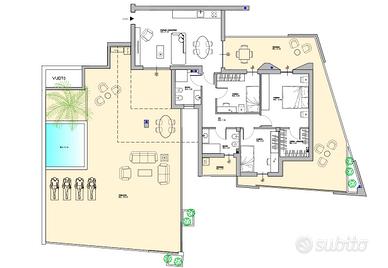 L'appartamento si apre su un ampio e luminoso living con angolo cottura, cuore pulsante della casa, che si estende verso una terrazza a livello di 118 mq: un vero e proprio salotto a cielo aperto, arricchito da una piscina rialzata privata. Uno spazio pensato per vivere ogni stagione, ideale per momenti di relax, pranzi e cene all'aperto, barbecue o serate indimenticabili in compagnia di amici e famiglia.
