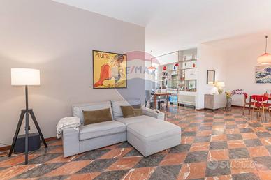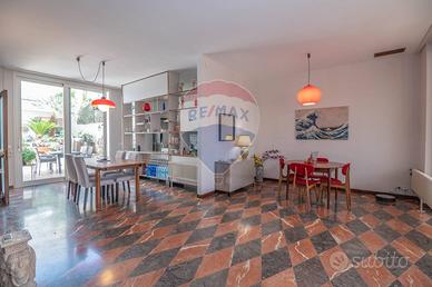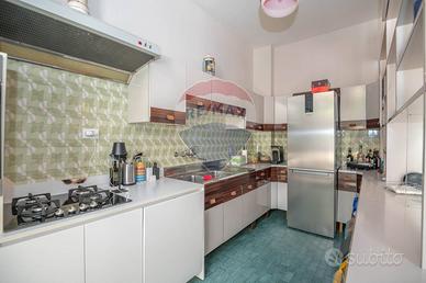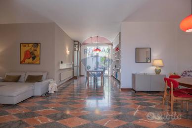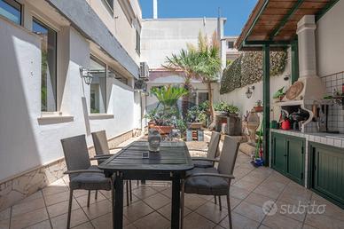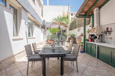 un ampio salone che funge anche da sala pranzo, a seguire una cucina a vista, con accesso al cortile interno e giardino di circa 50 mq, ove è presente una splendida e funzionale cucina in muratura.