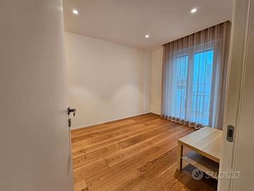 Un ampio open space dove estetica e funzionalità si fondono in modo magistrale. Divano di design, luminosità su misura e parete attrezzata sospesa. Cucina integrata con ante bianche e top in prezioso marmo Calacatta oro, completa di elettrodomestici di fascia alta.