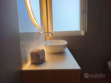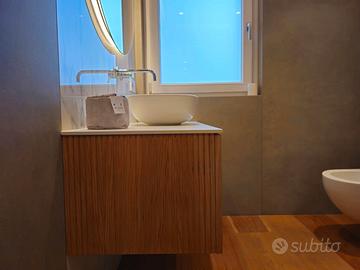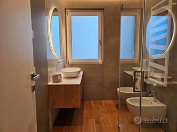 Due bagni da rivista, rifiniti in microcemento/resina, con sanitari sospesi, rubinetteria premium, specchi retroilluminati e docce walk-in.