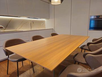 Zona pranzo scultorea con tavolo in massello. Tutto è pronto, tutto è perfetto.