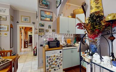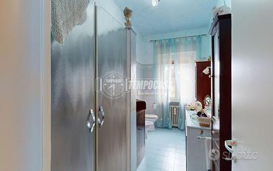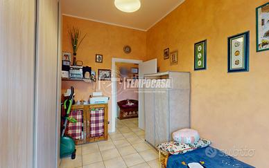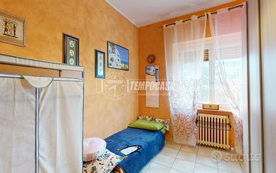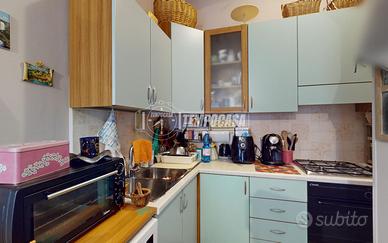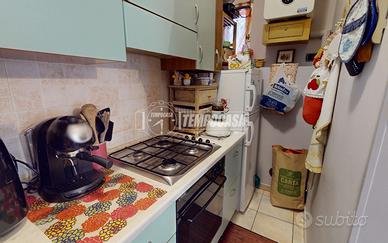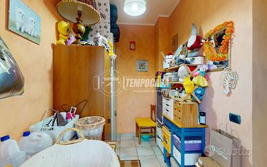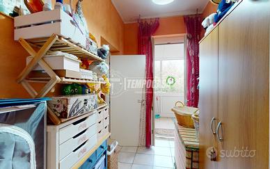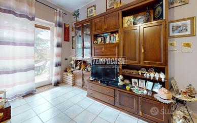 L'immobile si trova al piano terra di un piccolo stabile e si sviluppa su 90 mq. L'ingresso è direttamente nella zona giorno con cucina a vista; da qui è possibile uscire direttamente sulla corte esclusiva in parte lastricata, in parte piantumata di 115 mq. La zona notte si compone di una camera matrimoniale di 17 mq, una camera singola, il bagno con cabina doccia ed attacco per la lavatrice, oltre ad un ripostiglio con uscita su un terrazzo abitabile. Completano la proprietà un box auto di 16 mq ed una cantina al piano seminterrato.