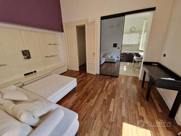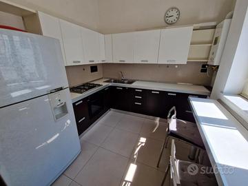 Ingresso su ampio salone open space con cucina a vista separata da porta in vetro, completamente arredata e di recente installazione.