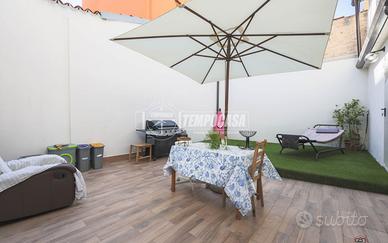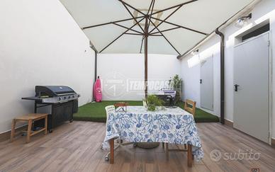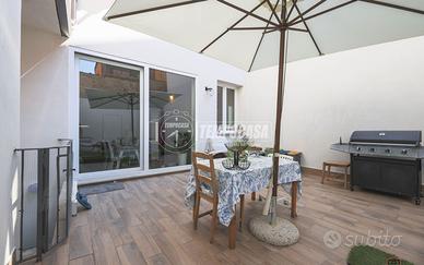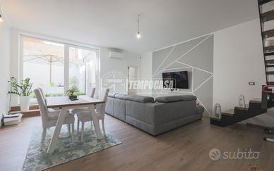 Piano Terra: Ingresso con porta blindata e videocitofono, ampio e luminoso soggiorno di circa 40 mq con pavimentazione in gres porcellanato effetto legno. L'ambiente è valorizzato da ampie vetrate scorrevoli in PVC con triplo vetro, che conducono direttamente al giardino privato di circa 70 mq. per concludere al piano troviamo anche il cucinotto con cucina su misura ed un comodo bagno su misura.