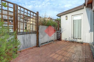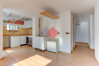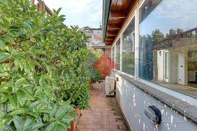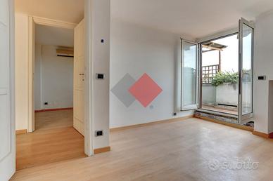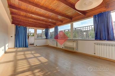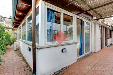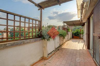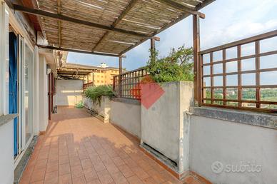 L'appartamento è così composto: Ingresso, soggiorno con cucina a vista, due camere da letto, un bagno e un ampio terrazzo perimetrale di 50 mq, che circonda l'intera abitazione.