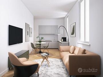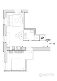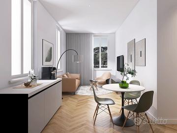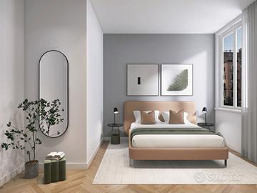 Entrando troveremo, lungo il corridoio d'ingresso, una comoda zona lavanderia ed un servizio; proseguendo, la soluzione si aprirà su un luminoso soggiorno con angolo cottura e con doppia esposizione che avrà vista sullo splendido parco di Villa Massimo. Troveremo sulla parte sinistra della soluzione un'ampia camera con affaccio sul verde. Completerà la proprietà un comodo soppalco.