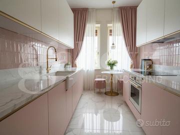 L'appartamento è composto da salone, cucina separata, una camera matrimoniale, bagno e un giardino privato di circa 30mq. Tutti gli ambienti sono collegati con l'esterno grazie a delle grandi porte finestre che donano luminosità e ariosità all'immobile.