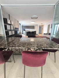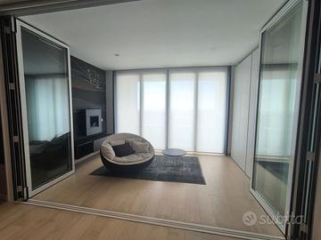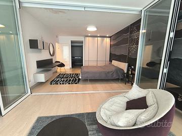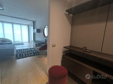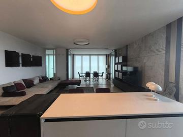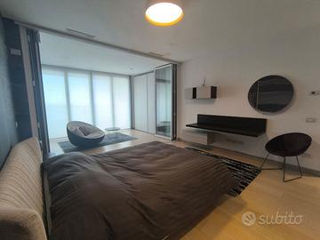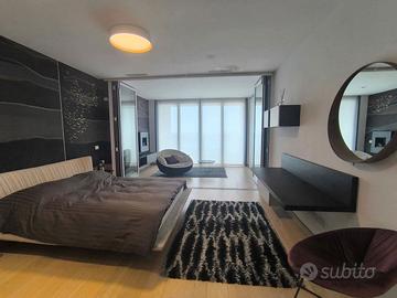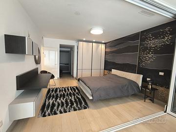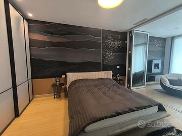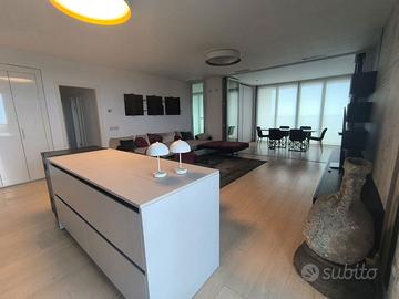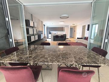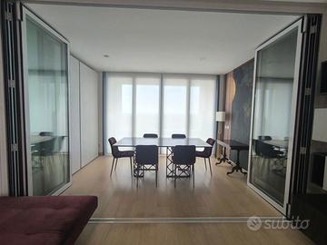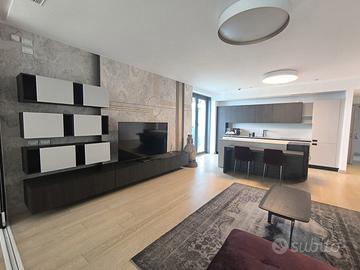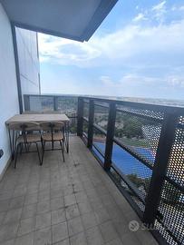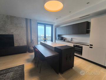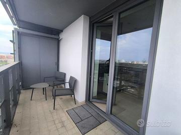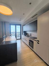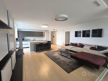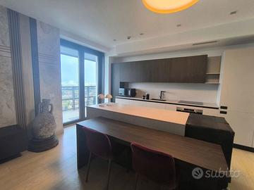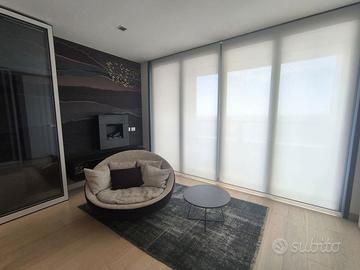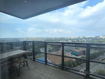 Rif. L39/25 - Eur Torrino, quartiere dalla storia architettonica razionalista e geometrica nel quale l'edificio residenziale più alto della Capitale si fonde in maniera armonica, nel nuovo polo commerciale adiacente Euroma2, è sorto recentemente l'esclusivo e moderno grattacielo denominato EuroSky Tower che accoglie i suoi visitatori e residenti con un'ampia e prestigiosa hall con portineria e sistemi di sicurezza 24/7. Le facilities offerte dalla Torre rendono unica l'esperienza ai suoi residenti. In questo elitario contesto proponiamo in locazione uno spettacolare, elegante e confortevole appartamento, completamente e finemente arredato, caratterizzato dalla posizione angolare al 18° piano della Torre e dalla comoda metratura interna data dalla composizione sviluppata su 3 moduli. L'unità immobiliare, con panoramica e solare esposizione ad ovest e a nord con spettacolare vista sulla Capitale, è composta da ingresso, ampio salone con cucina a vista con isola e affaccio panoramico dal terrazzo, zona pranzo nella serra bioclimatica con balconata, suite matrimoniale con cabina armadio e bagno privato e riservata area relax con accesso al terrazzo, spaziosa camera da letto con ampia cabina armadio, altro servizio con doccia idromassaggio, ripostiglio con vano lavanderia. Completano la proposta un comodo box auto ed un indispensabile posto auto coperto e videosorvegliato. I moderni appartamenti sono stati progettati per offrire spazi comodi e funzionali, con infissi a tutta altezza verso i terrazzi esterni che garantiscono luminosità e completa flessibilità di uso degli ambienti interni delle abitazioni. Sono serviti da sistema di domotica integrato, personalizzabile, che permette il controllo totale di tutte le funzioni dell'unità abitativa da un'unica interfaccia, comandabile anche a distanza; comfort e qualità dell'aria nell'abitazione sono garantiti dagli impianti di riscaldamento e di raffreddamento a pavimento, dalla ventilazione assistita per la pu
