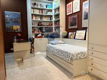 Le stanze si dislocano a raggiera, dal comodo disimpegno, attraverso grandi vetrate e porte in legno, gli ampi balconi fanno da cornice a tutto lappartamento.