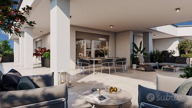Al piano terra troviamo 3 appartamenti dotati di giardino privato. L'immobile in oggetto è composto da 4 locali, doppi servizi ed è suddiviso in un ampio salone con vetrata panoramica sul porticato di generose dimensioni e giardino, una cucina abitabile aperta, tre camere di cui una con cabina armadio e bagno privato, secondo servizio e giardino d'angolo per un estensione complessiva di circa 230 mq - Ottimo investimento 335.000,00 - Box doppio ad 30.000,00.