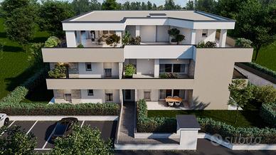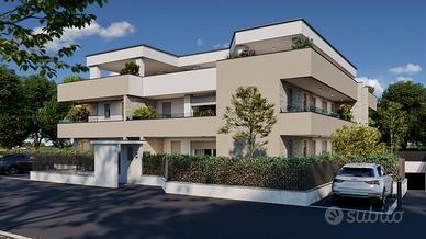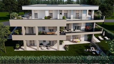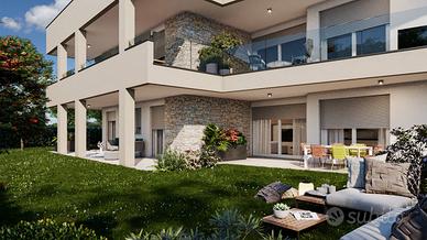 Al piano terra troviamo 3 appartamenti dotati di giardino privato. L'immobile in oggetto è composto da 4 locali, doppi servizi ed è suddiviso in un ampio salone con vetrata panoramica sul porticato di generose dimensioni e giardino, una cucina abitabile aperta, tre camere di cui una con cabina armadio e bagno privato, secondo servizio e giardino d'angolo per un estensione complessiva di circa 130 mq - Ottimo investimento 335.000,00 - Box doppio ad 30.000,00.