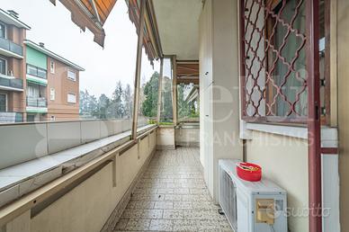 ingresso, cucina abitabile con terrazzo verandato che confina con la cameretta, soggiorno con balcone che collega alla camera matrimoniale, ripostiglio e due bagni.