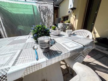 Appartamento al piano terra di mq 110 con ingresso su soggiorno, cucina abitabile, tre camere da letto di cui due matrimoniali di cui una padronale molto spaziosa ed una doppia, due bagni entrambi dotati di finestra di cui uno con vasca ed uno con doccia. Scala interna per accesso al rustico di mq 110 cosi suddiviso: ampio rustico, cucina abitabile, due camere da letto, un bagno, due locali ripostiglio. Completa la proprietà un garage di mq 24 al piano seminterrato e una corte esterna perimetrale a tutto l'appartamento per una superficie di mq 200 in parte a giardino ed in parte pavimentata. Esposizione nord - est - ovest.