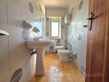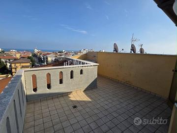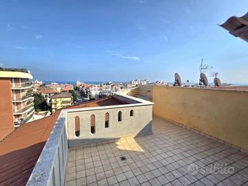 Appartamento 100 mq, posto al quinto piano con ascensore (fino al 4° piano - utlimo tramite scale), composto da ingresso, ampio soggiorno, cucinotto separato, tre camere da letto di cui una spaziosa matrmoniale, una doppia ed una piccolissima singola, due bagni entrambi con finestra (di cui effettuato nel 2023), due balconi a livello di cui uno nella zona giorno ed uno nella zona notte per complessivi mq 8. Completa la proprieta un terrazzo al piano superiore di mq 15 con accesso interno ed un locale sottoscale come ripostiglio di mq 5. Esposizione sud - nord - ovest nella parte dell'unità abitatva e esposione a 360° nella parte del terrazzo sovrastante. vista mare e monti.