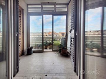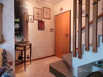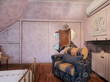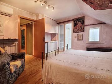 L'appartamento di circa 99mq compresi i balconi, si sviluppa su due livelli, al piano inferiore l'appartamento è organizzato in un ingresso su soggiorno, con balcone, una cucina abitabile con camino, e ulteriore balcone abitabile, una camera matrimoniale, un bagno. Attraverso una scala interna si accede al piano superiore con destinazione soffitta, in cui sono presenti due camere matrimoniali e un bagno, oltre due balconi, il piano superiore presenta delle spiovenze e gli spazi con altezza minima sono stati in parte ottimizzati ricavando degli armadi a muro .