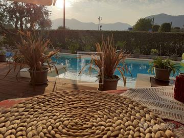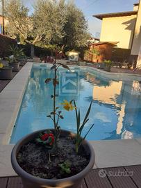 Allesterno si trova un ampio portico coperto di 18 m², dotato di tende da sole e chiusure in PVC, perfetto come prolungamento della zona giorno e vivibile tutto lanno. Il giardino privato di circa 250 m² è il punto di forza della proprietà: ospita una splendida piscina esclusiva con idromassaggio, riscaldabile tramite pompa di calore, immersa in unelegante area relax in legno/PVC con doccia esterna ad acqua calda. Completano lo spazio esterno una fontana ornamentale, un barbecue in muratura e una casetta in legno per gli attrezzi.
