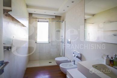 Bagno in stile moderno, rifinito con materiali di qualità e dotato di doccia a "filo pavimento" con ante in vetro,