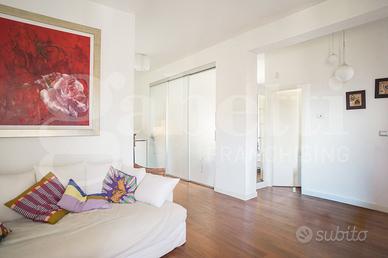 L'ingresso conduce a un soggiorno accogliente e luminoso, con cucina adiacente, separata da una elegante porta vetrata scorrevole, che consente di separare gli ambienti mantenendo tuttavia una certa continuità tra loro.