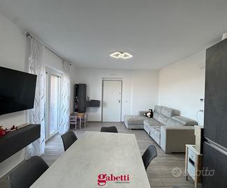 In un condominio di recente costruzione, realizzato nel 2019, proponiamo un appartamento al piano terra molto luminoso, ideale per chi cerca comfort, efficienza e spazi ben organizzati. L'ingresso conduce a un soggiorno con angolo cottura a vista, accogliente e funzionale, con uscita diretta su un terrazzo di circa 15 mq, perfetto per pranzi all'aperto o momenti di relax, con vista mare. La zona notte è ben distribuita e comprende una camera matrimoniale, una cameretta, uno studio e due bagni, oltre a un secondo balcone di circa 8 mq. Completa la proprietà un garage di 18 mq, dotato di porta che consente l'accesso diretto all'interno del condominio, una soluzione comoda soprattutto nei mesi invernali, oltre a un posto auto di circa 17 mq. Dal punto di vista impiantistico l'abitazione è moderna ed efficiente: riscaldamento a pavimento, pompa di calore, fotovoltaico privato da 1,8 kW e assenza totale di gas, per un comfort elevato e costi di gestione contenuti. Consegna prevista entro il 15 settembre 2026. Una casa recente, funzionale e pronta per il futuro, con spazi esterni vivibili e dotazioni moderne.
