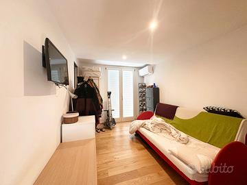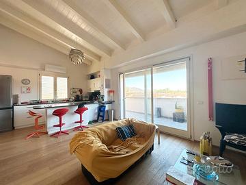 L'abitazione si distingue per la luminosità e gli spazi ben distribuiti: un'accogliente zona giorno open space con cucina a vista si apre direttamente su un ampio terrazzo che circonda l'appartamento su tre lati, ideale per momenti di relax e cene all'aperto.