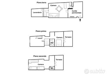 Al piano terra si trova un'ampia zona giorno collegata alla cucina, con accesso diretto al cortile pavimentato d'ingresso, utile come spazio pratico di servizio. Attraverso la scala interna si raggiunge il primo piano, dove si sviluppa la prima zona notte con camera, servizio e il primo terrazzo, che affaccia sul contesto circostante. Il secondo piano ospita un'ulteriore camera da letto con bagno e un secondo terrazzo, anch'esso ben sfruttabile.