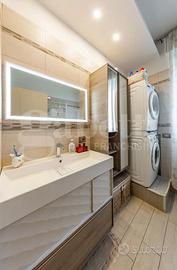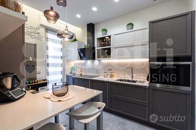 L'ingresso accoglie con controsoffittature LED, che accompagnano verso un soggiorno davvero grande, elegante e molto luminoso, con uscita sul balcone lungo con vista aperta.