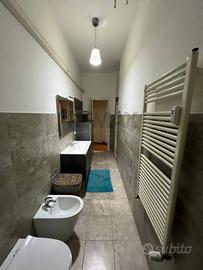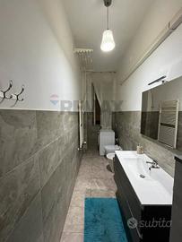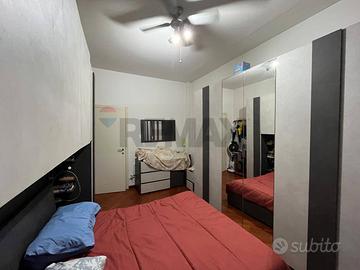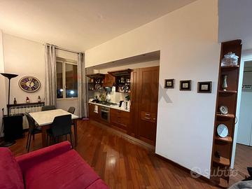 Ingresso in ampia zona soggiorno pranzo con corridoio di ingresso, con una camera singola e una matrimoniale e bagno finestrato con doccia e ripostiglio in quota.