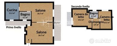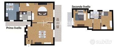Al secondo livello si sviluppa la zona notte, composta da due camere da letto, di cui una con uscita su balcone, e un secondo bagno, funzionale e ben distribuito.
