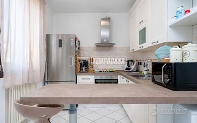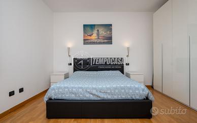 L'ingresso si apre su un'ampia zona giorno con cucina open space a "L", una conformazione che garantisce riservatezza alla cucina, non visibile direttamente entrando. Dal disimpegno si accede al primo bagno finestrato con doccia e alla prima camera da letto matrimoniale, con pavimento in parquet, presente in tutte le camere dell'abitazione.