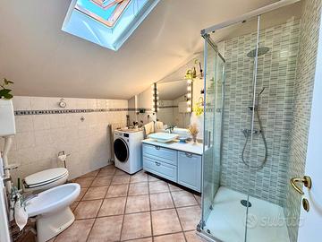 Il piano mansardato si conclude con un ampio bagno-lavanderia fornito di comoda doccia, predisposizione per la lavatrice e c'è anche lo spazio per l'asciugatrice. Inoltre il bagno è stato dotato di lucernario elettrico: comodamente apribile con un tasto e dotato di sensore per la chiusura automatica in caso di pioggia.