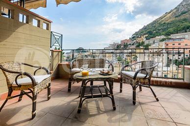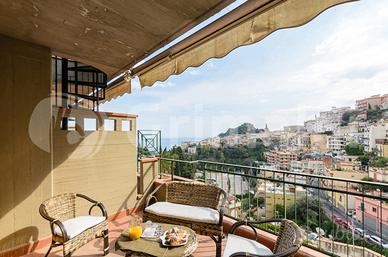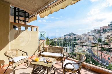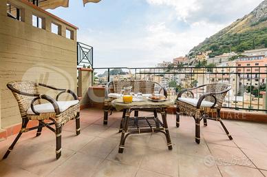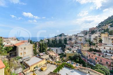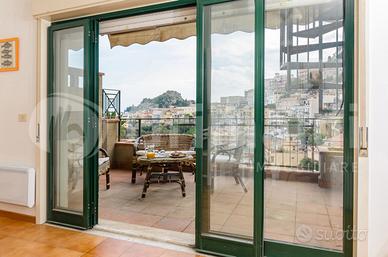 Taormina cpl. "Gardenia" Via Fontana Vecchia panoramico appartamento composto da soggiorno con zona cottura, camera da letto, bagno, veranda di 15 mq con vista panoramica, terrazza soprastante di 80mq direttamente collegata con scala dall'appartamento. Completa la proprietà una cantina ed è disponibile un Posto Auto. Classe G.