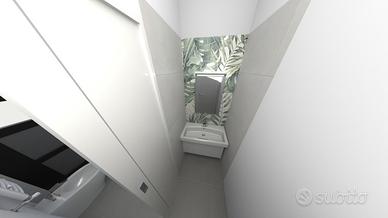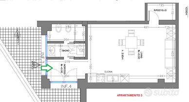 L'immobile si apre su un comodo disimpegno che conduce alla zona living open space, con angolo cottura, ripostiglio e bagno finestrato completo di antibagno.