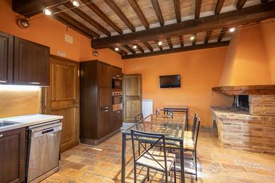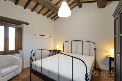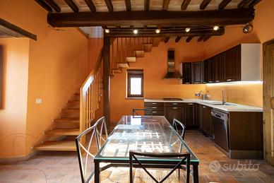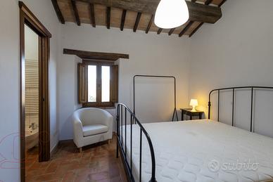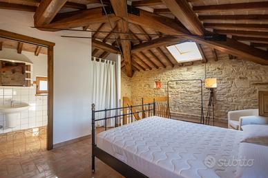 Al quarto piano, collegato anch'esso da scala interna, troviamo la suite con bagno. Anche questo ambiente è molto curato, con pietra a vista e travi in legno. Le finestre di ampie dimensioni garantiscono luminosità e offrono una vista incantevole sulle colline circostanti.