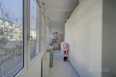 Ampio Quadrilocale di 117 mq con Doppi Servizi e Veranda. In Via Baltea 25, all'interno del complesso storico "Case Grassi" realizzato nei primi anni '20, proponiamo un appartamento di ampia metratura costituito dall'intero primo piano. L'immobile si distingue per una superficie commerciale di 116,70 mq, offrendo spazi generosi e una distribuzione funzionale, ideale sia per famiglie che per investimento. Caratteristiche Principali * Superficie Abitativa: L'abitazione principale copre 94,55 mq commerciali. * Zona Giorno e Veranda: Ingresso su disimpegno, soggiorno e cucina che si affacciano su un'ampia veranda abitativa di 14,80 mq, già predisposta per l'uso cucina. * Zona Notte: Due camere da letto matrimoniali di ampie dimensioni (circa 16,5 mq ciascuna), entrambe dotate di balcone privato con affaccio su via Baltea. * Doppi Servizi: L'appartamento dispone di due bagni completi. * Pertinenze: Una cantina di notevoli dimensioni al piano interrato (oltre 18 mq reali). Punti di Forza per l'Acquirente * Superfici: 116,70 mq commerciali calcolati secondo i criteri OMI (DPR 138/98). * Versatilità e Reddito: La pianta dell'immobile permette facilmente di ricavare una terza camera da letto, rendendolo perfetto per la locazione a studenti o lavoratori. * Spazi Esterni Vivibili: La veranda di quasi 15 mq rappresenta una vera e propria stanza aggiuntiva. * Dettagli d'Epoca: Lo stabile, progettato dall'Ing. Francesco Rossi, e realizzato dall'Impresa Ing. Grassi, conserva il fascino dell'architettura del primo dopoguerra con decorazioni e fregi in lito-cemento.