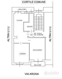 ingresso, 2 camere, cucina abitabile, bagno, 2 balconi e cantina.